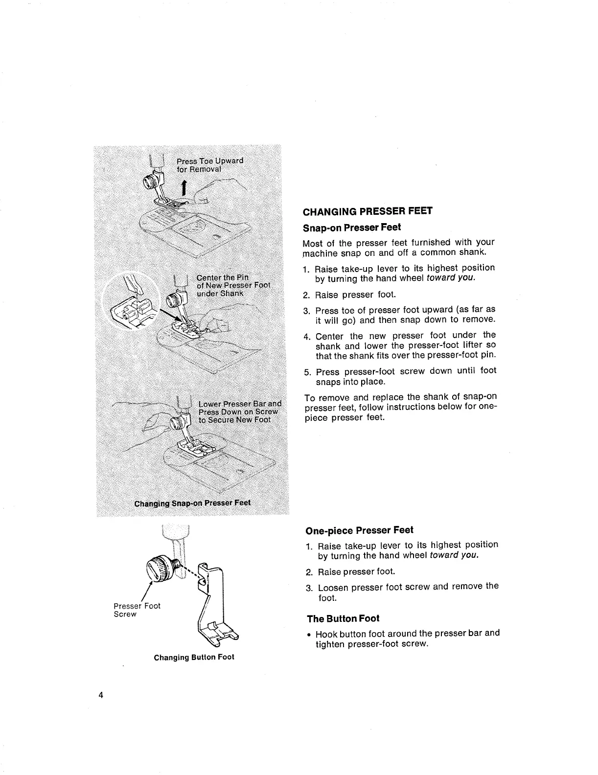 Singer Futurf II 920 - Changing Presser Feet; Snap-On Presser Feet; One-Piece Presser Feet; The Button Foot