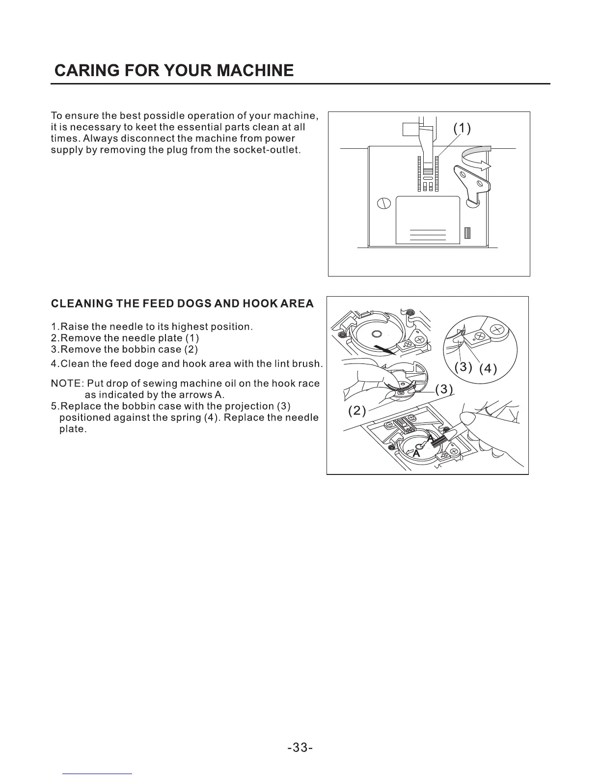 Singer FW75 - CARING FOR YOUR MACHINE; CLEANING THE FEED DOGS AND HOOK AREA