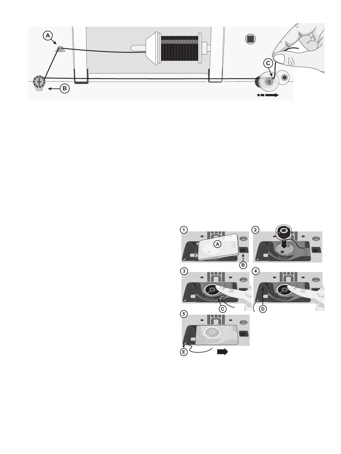 3. Thread through the hole in the bobbin (C) from the inside