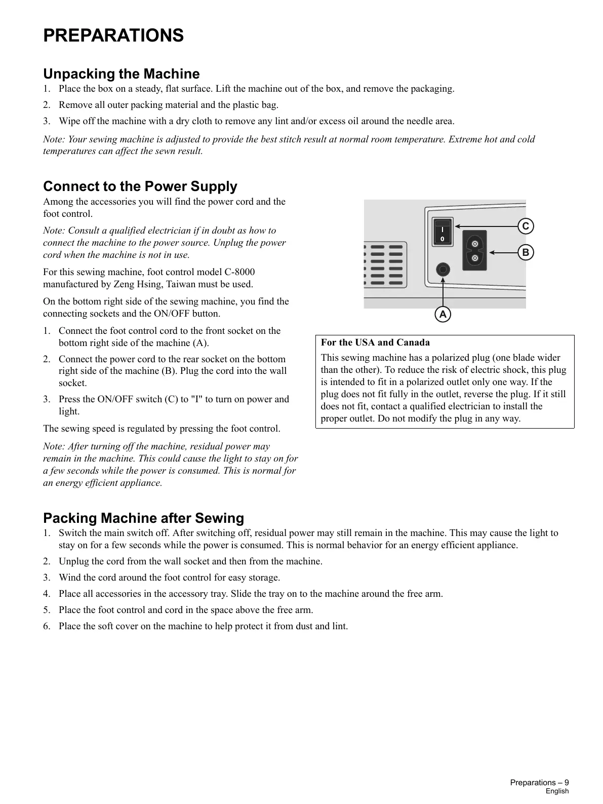 Singer HD 6700C - PREPARATIONS; Unpacking the Machine; Connect to the Power Supply; Packing Machine after Sewing