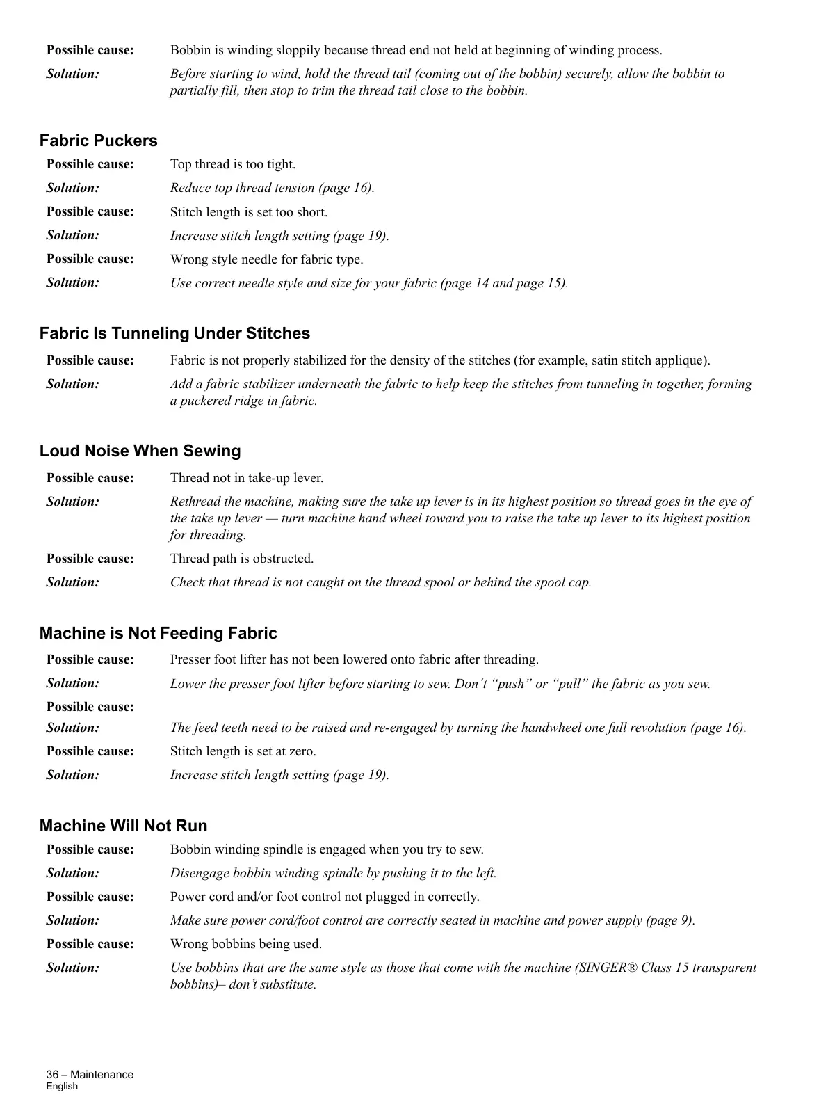 Use correct needle style and size for your fabric (page 14 and page 15).