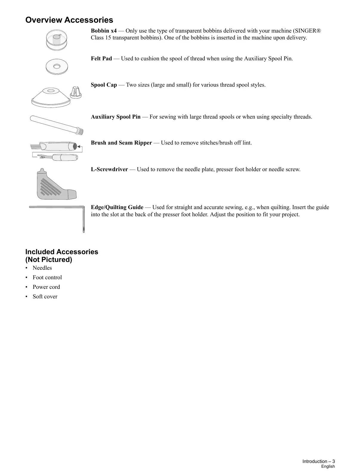Edge/Quilting Guide — Used for straight and accurate sewing, e.g., when quilting. Insert the guide