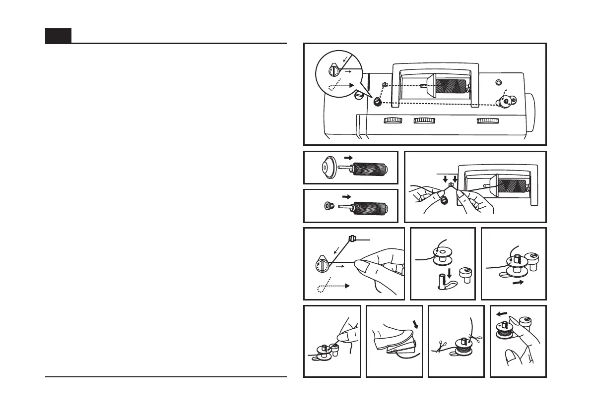 - Cut thread, push bobbin spindle to left (10) and remove.