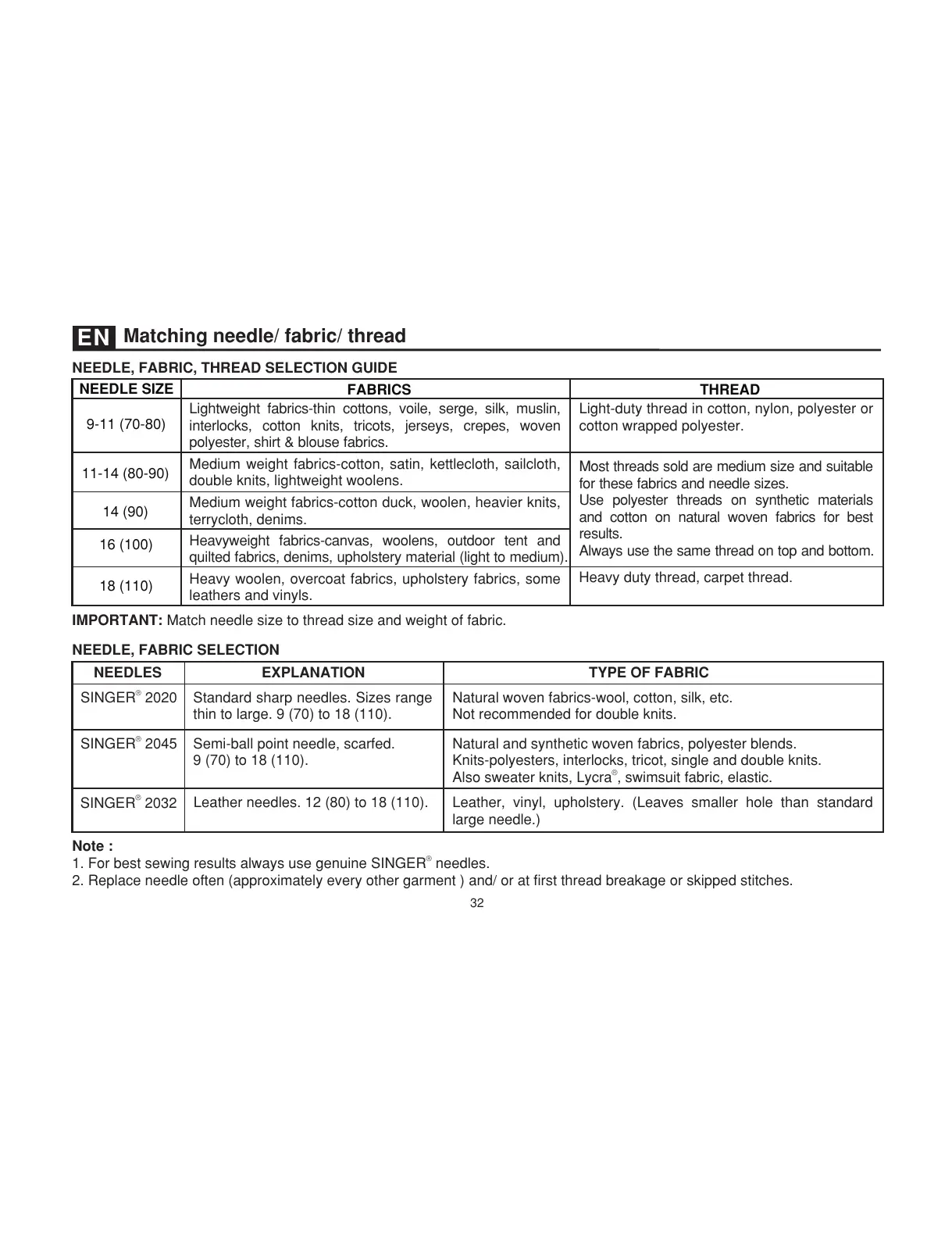 1. For best sewing results always use genuine SINGER needles.