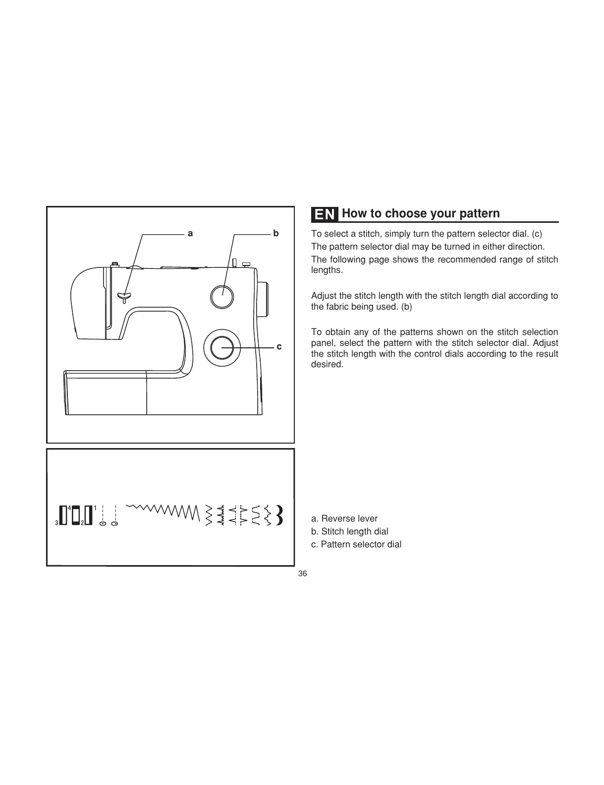To select a stitch, simply turn the pattern selector dial. (c)