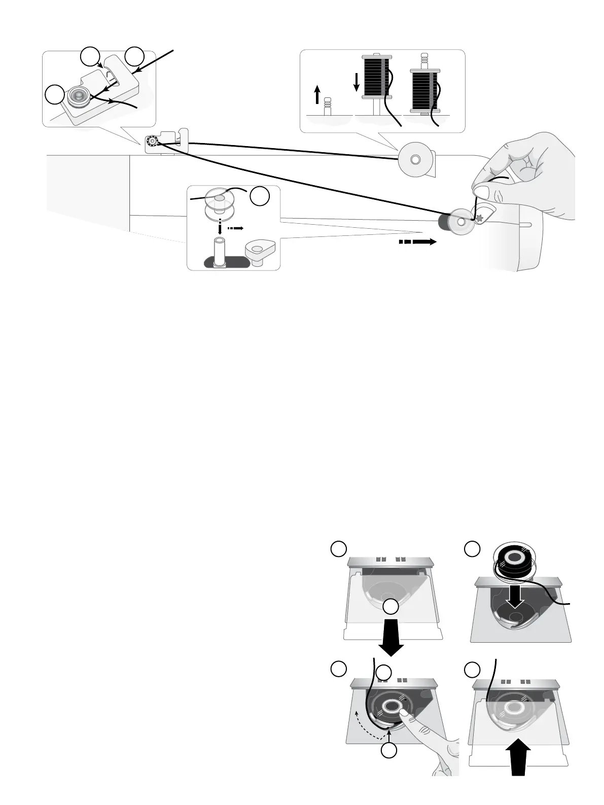 4. Thread through the hole in the bobbin (D) from the inside