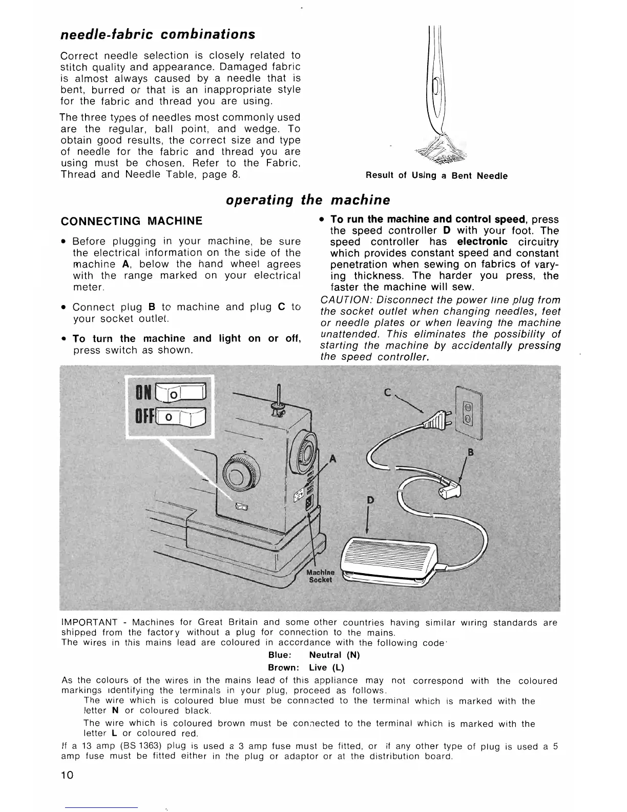 Singer Magic 22 - Needle-Fabric Combination Guidelines; Connecting the Sewing Machine; Operating the Sewing Machine