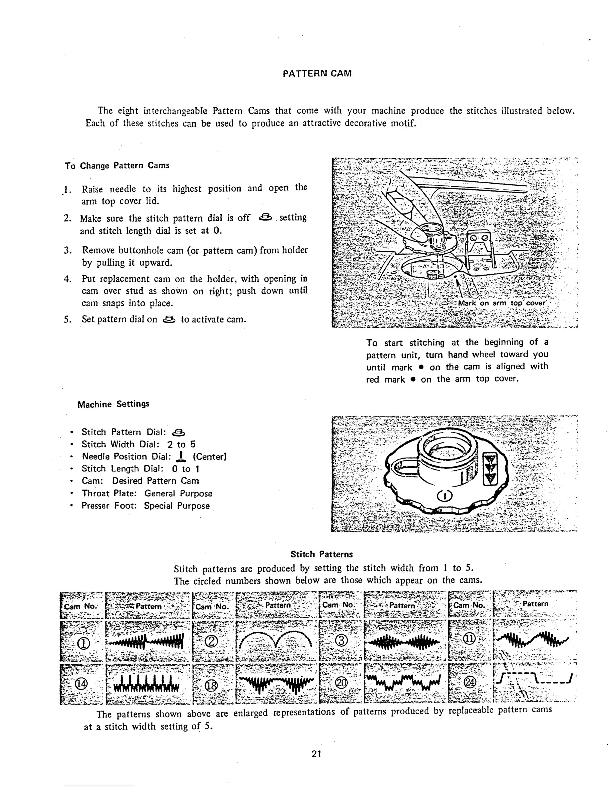 Singer Magic Bobbin 960U - Pattern Cam; To Change Pattern Cams; Machine Settings; Stitch Patterns