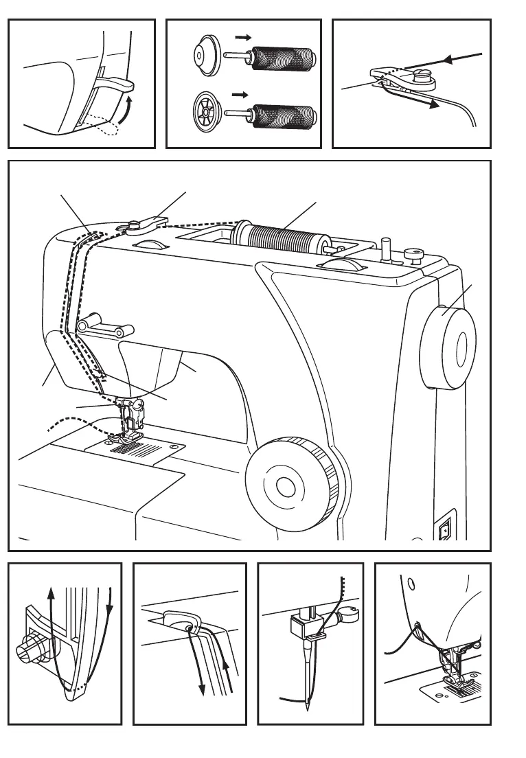 Now pass thread behind the thin wire needle clamp guide (8) and