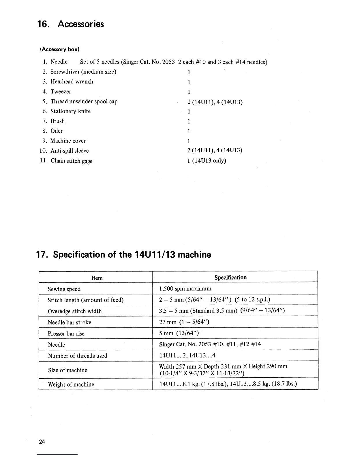 Singer Professional 14U13 - Included Accessories; Technical Specifications