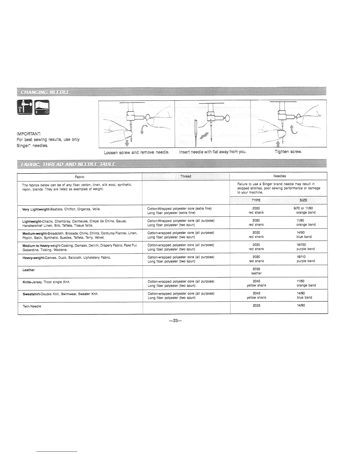 Singer Quantum 9240 - CHANGING NEEDLE; FABRIC, THREAD AND NEEDLE TABLE