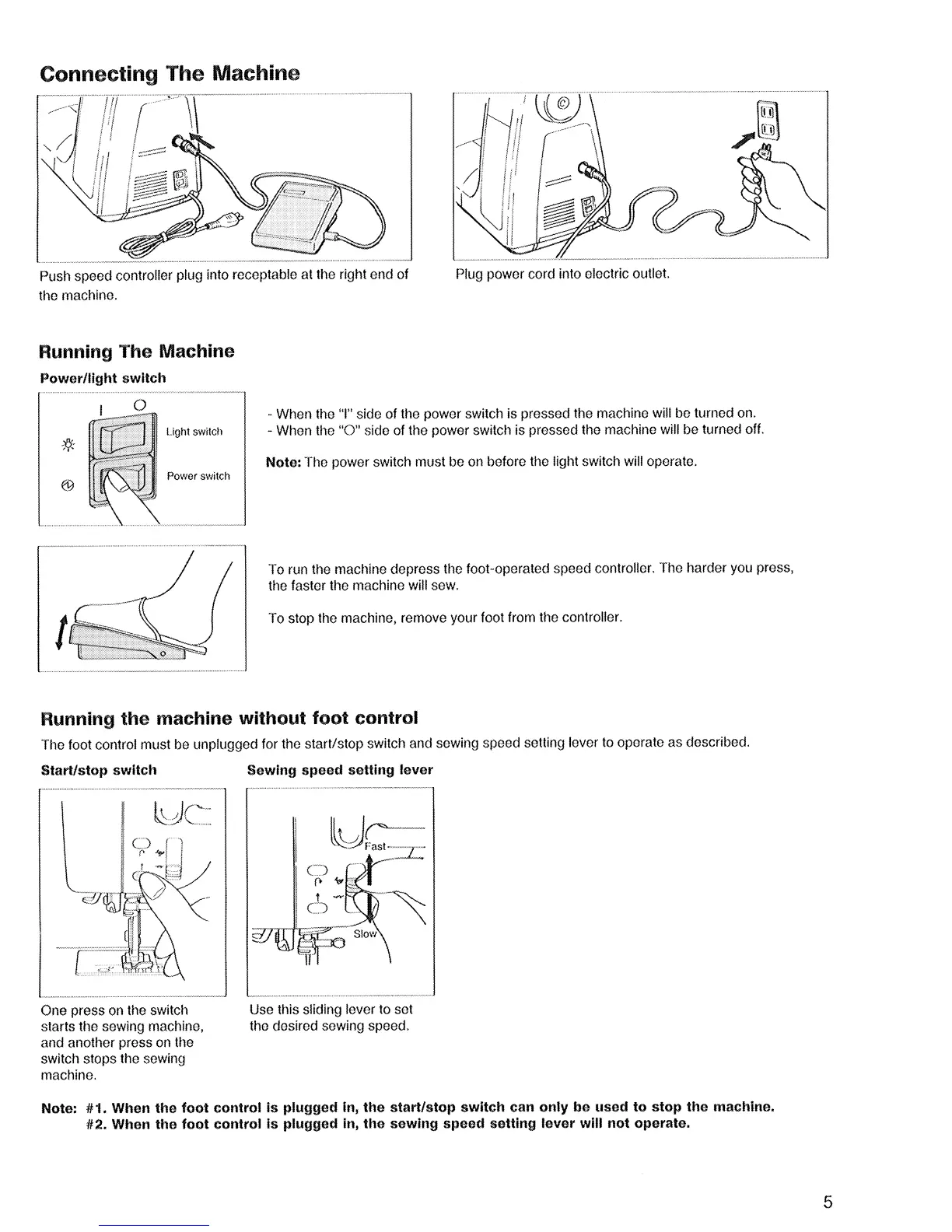 Singer Quantum XL-1 - Connecting the Machine; Running the Machine; Power;Light Switch; Running the Machine Without Foot Control