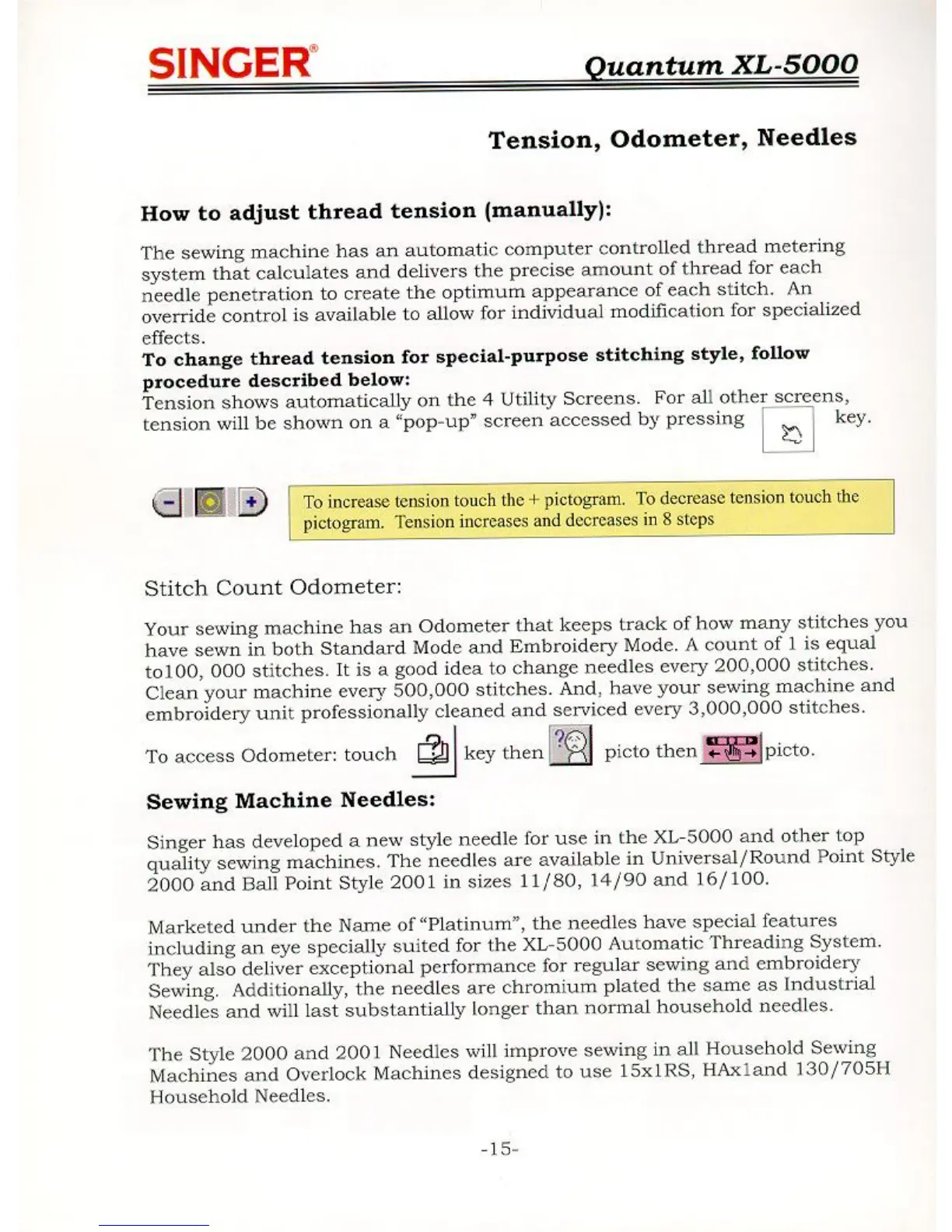 Singer QUANTUM XL-5000 - Tension, Odometer, Needles