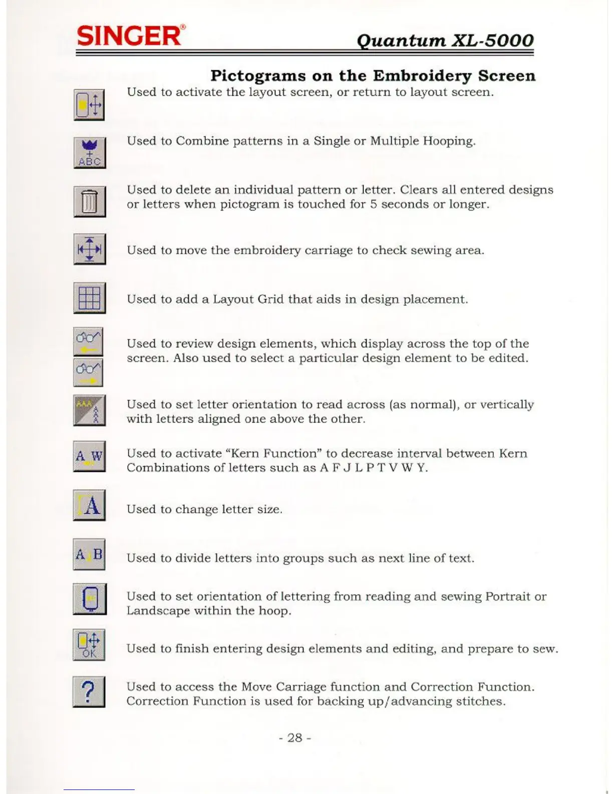 Singer QUANTUM XL-5000 - Pictograms on the Embroidery Screen