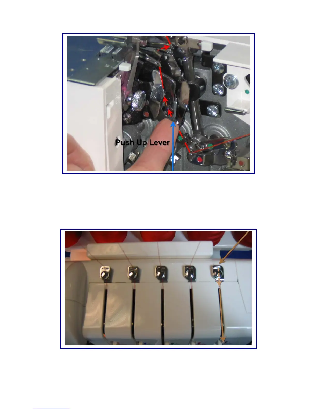 Tugging slightly on the thread tail at the back of the serger, push threader lever