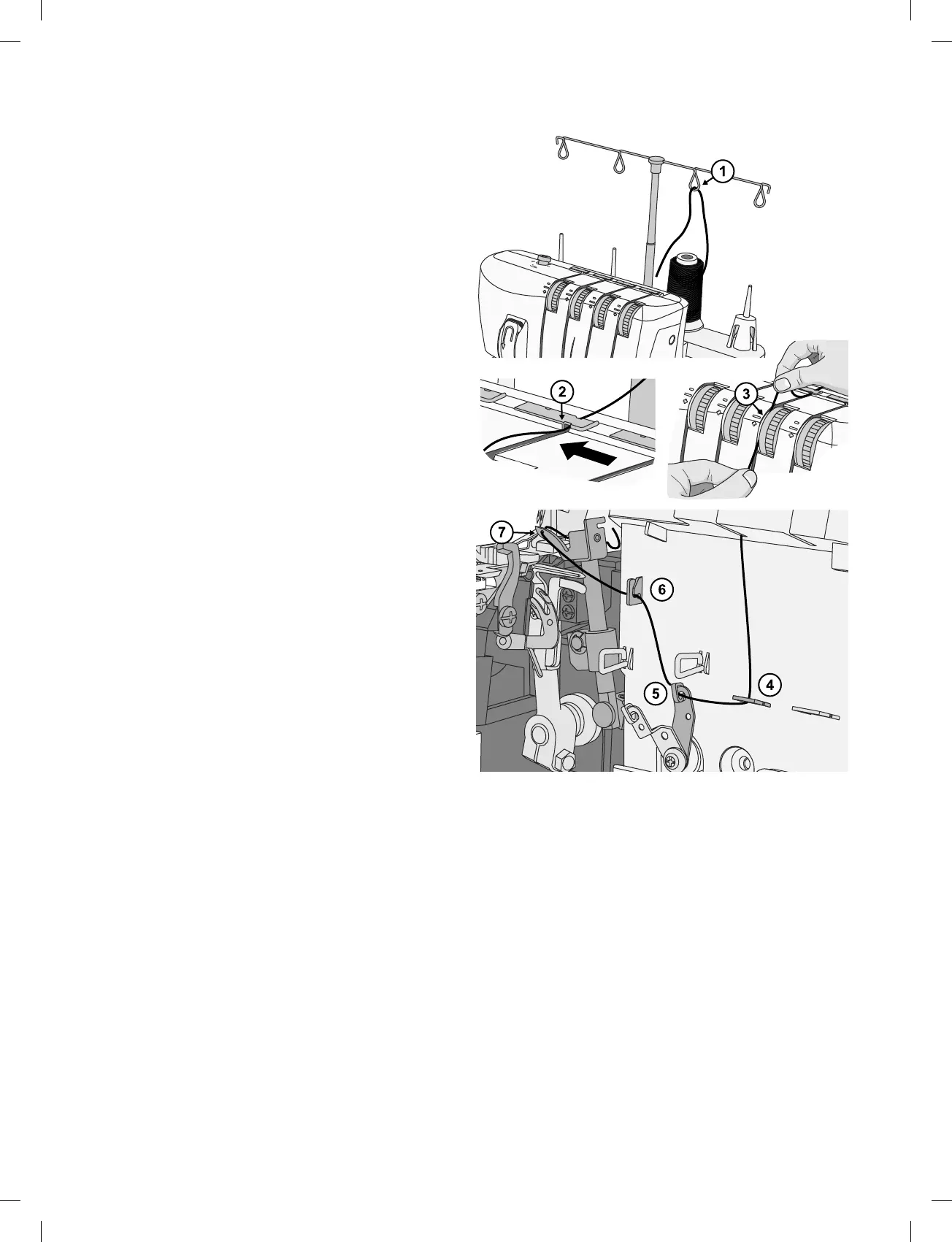 • Tire del hilo de derecha a izquierda por debajo del guiahilos