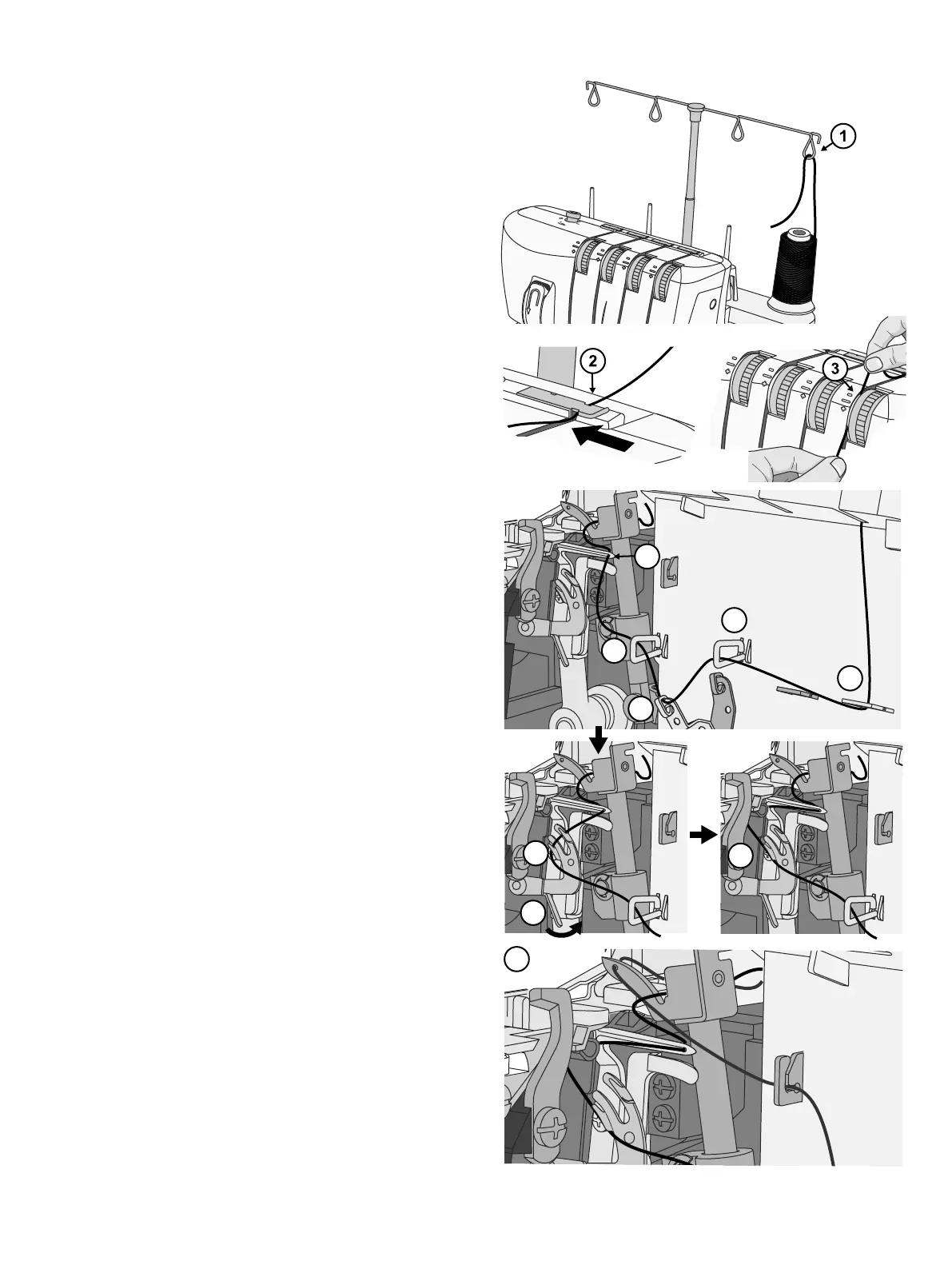 • After thread guide 7, pass the thread from front to back