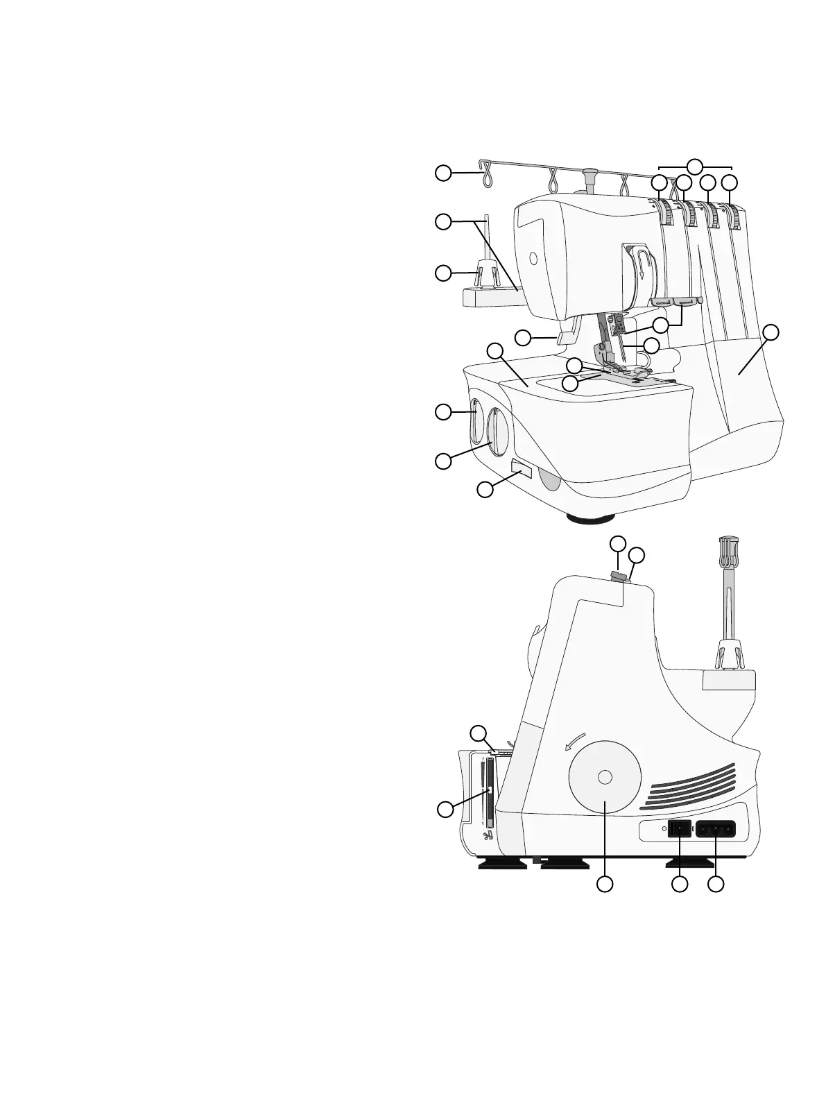 14. Bouton de tension de fil du boucleur supérieur (rouge)