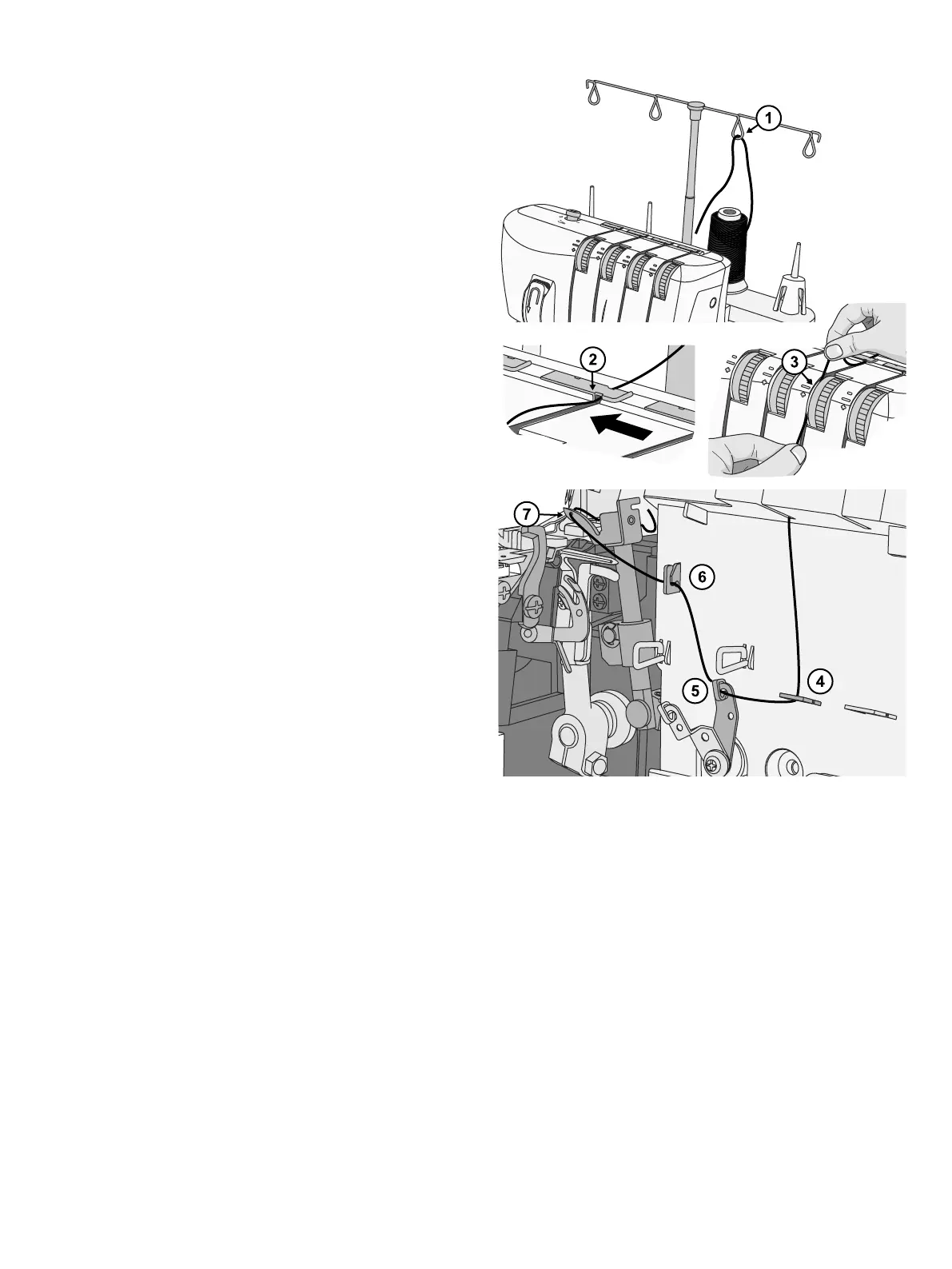 • Tirez le fil de droite à gauche sous le guide-fil supérieur (2).