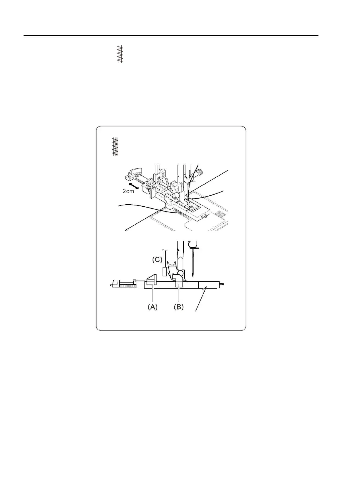 4. Lower the buttonhole lever (C) so that it drops down vertically between the stoppers (A) and (B).