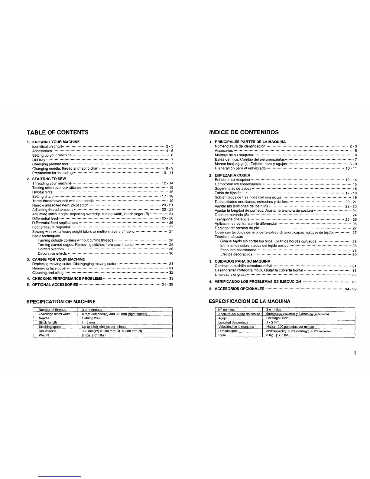 Changing needle, thread and fabric chart..................................................... 8 - 9