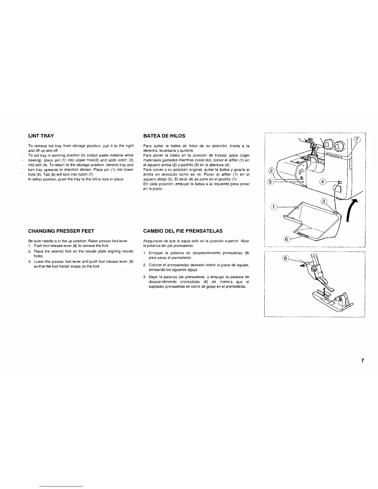 3. Lower the presser foot lever and push foot release lever (8)