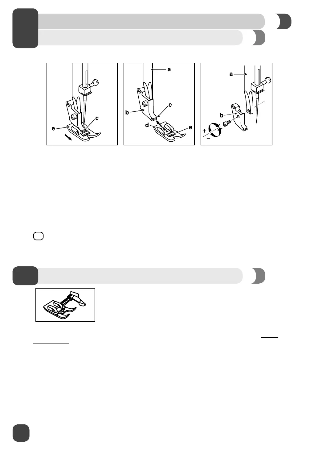 groove (c). The foot will release. To attach a presser foot, slide the pin (d) of the presser foot (e) into