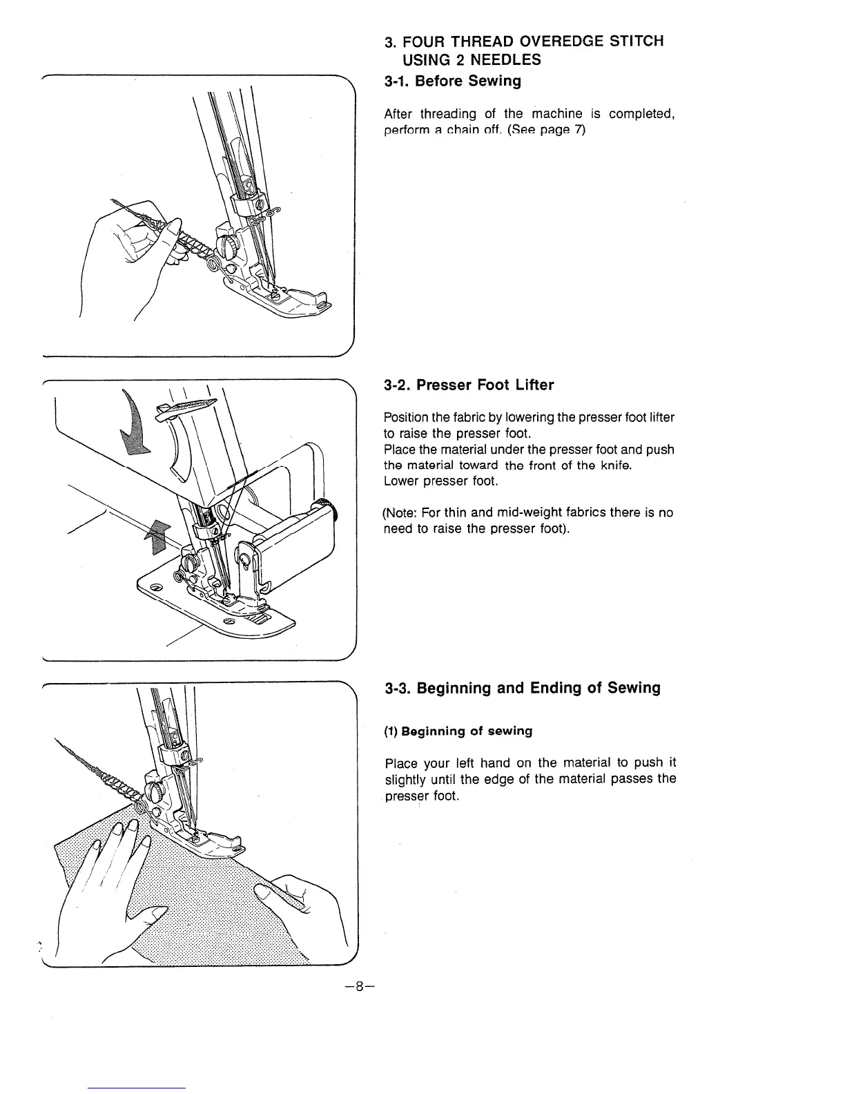 Singer SL234D - Four-Thread Overedge Stitch Operation; Pre-Sewing Steps; Using the Presser Foot Lifter; Beginning and Ending Sewing