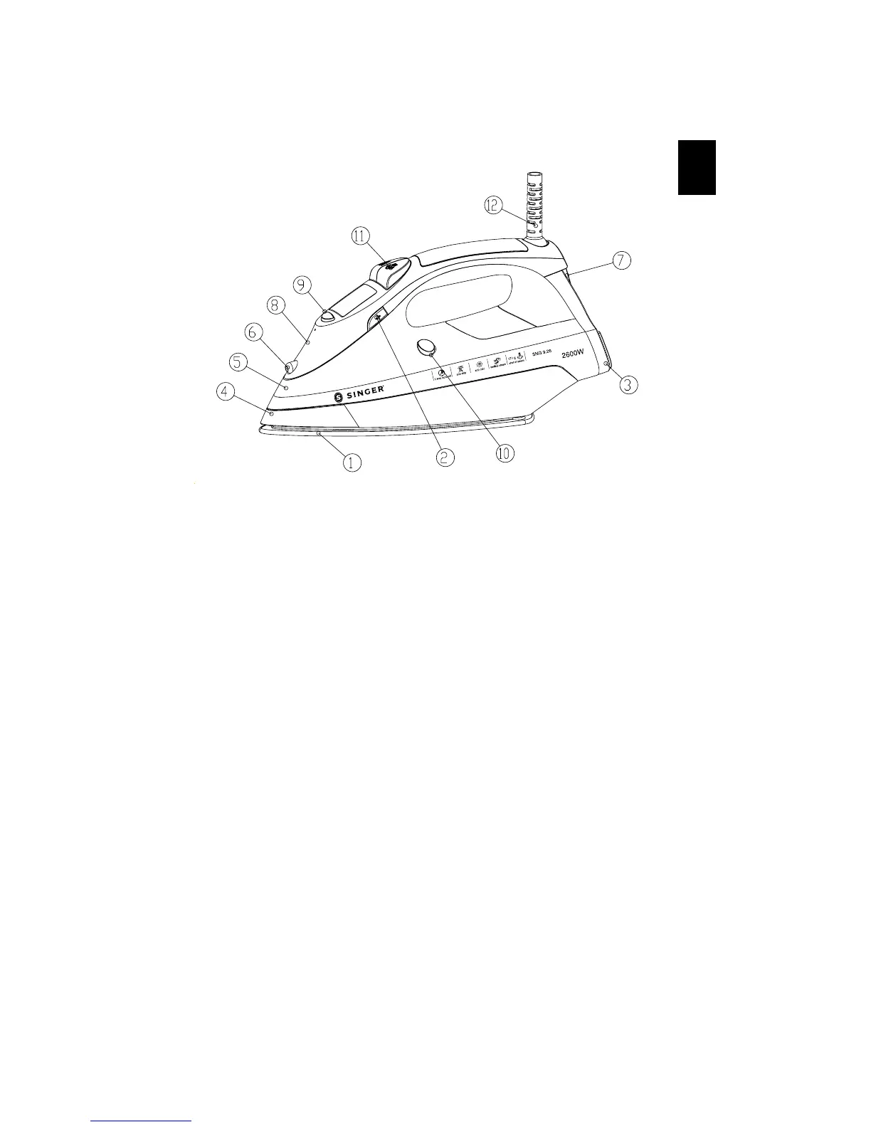 (11) Spay/shot steam button (12) Cord bushing