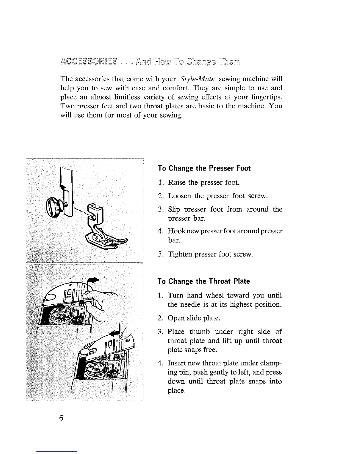 Singer Style-Mate 348 - Accessories and How to Change Them; Changing Presser Foot and Throat Plate
