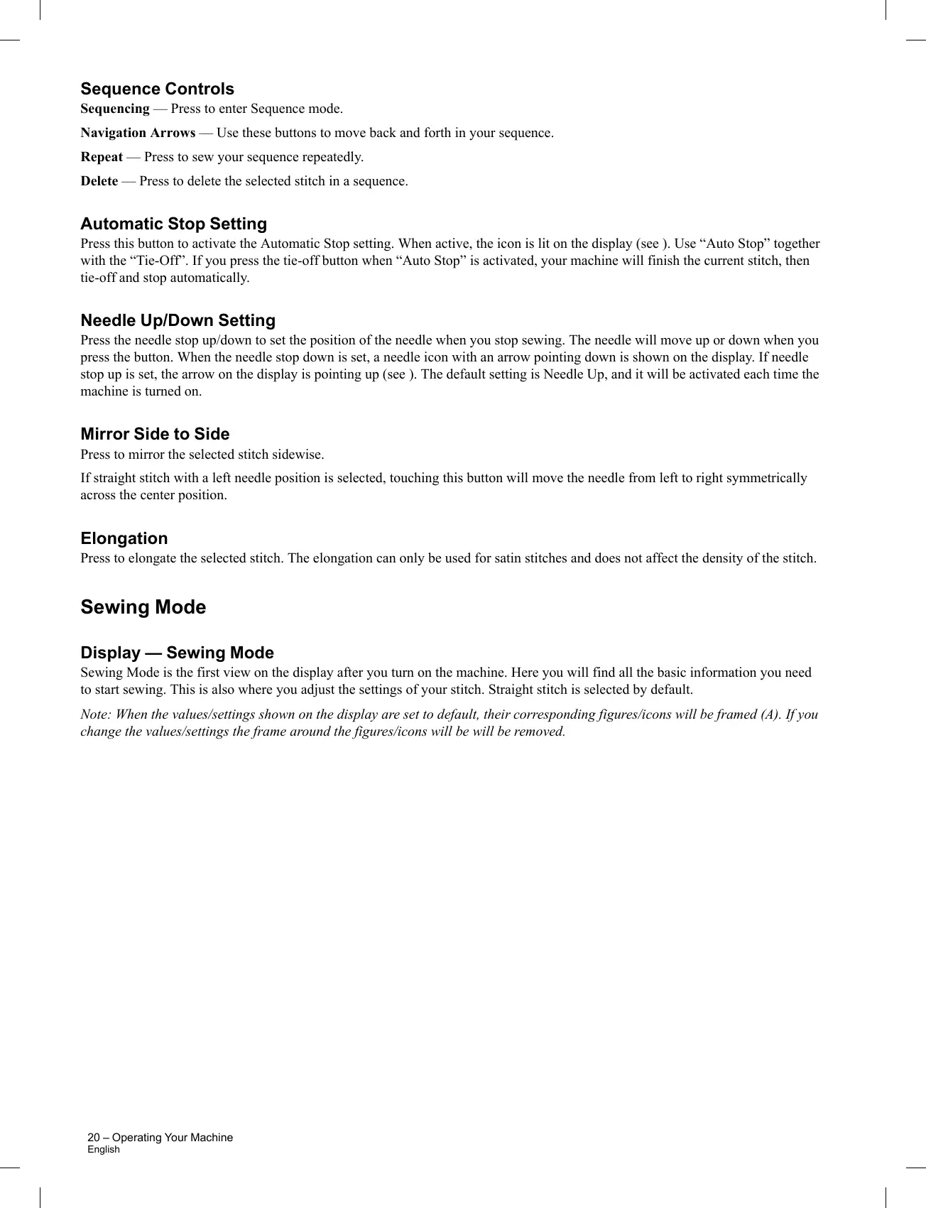 stop up is set, the arrow on the display is pointing up (see ). The default setting is Needle Up, and it will be activated each time the