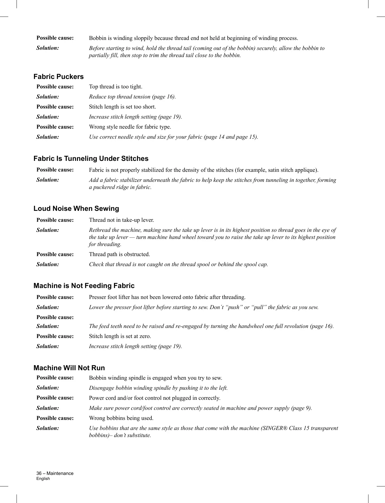 Use correct needle style and size for your fabric (page 14 and page 15).