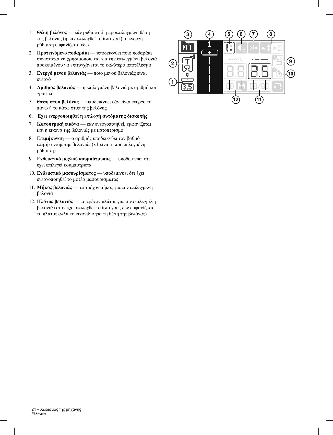 12. Πλάτος βελονιάς — το τρέχον πλάτος για την επιλεγμένη