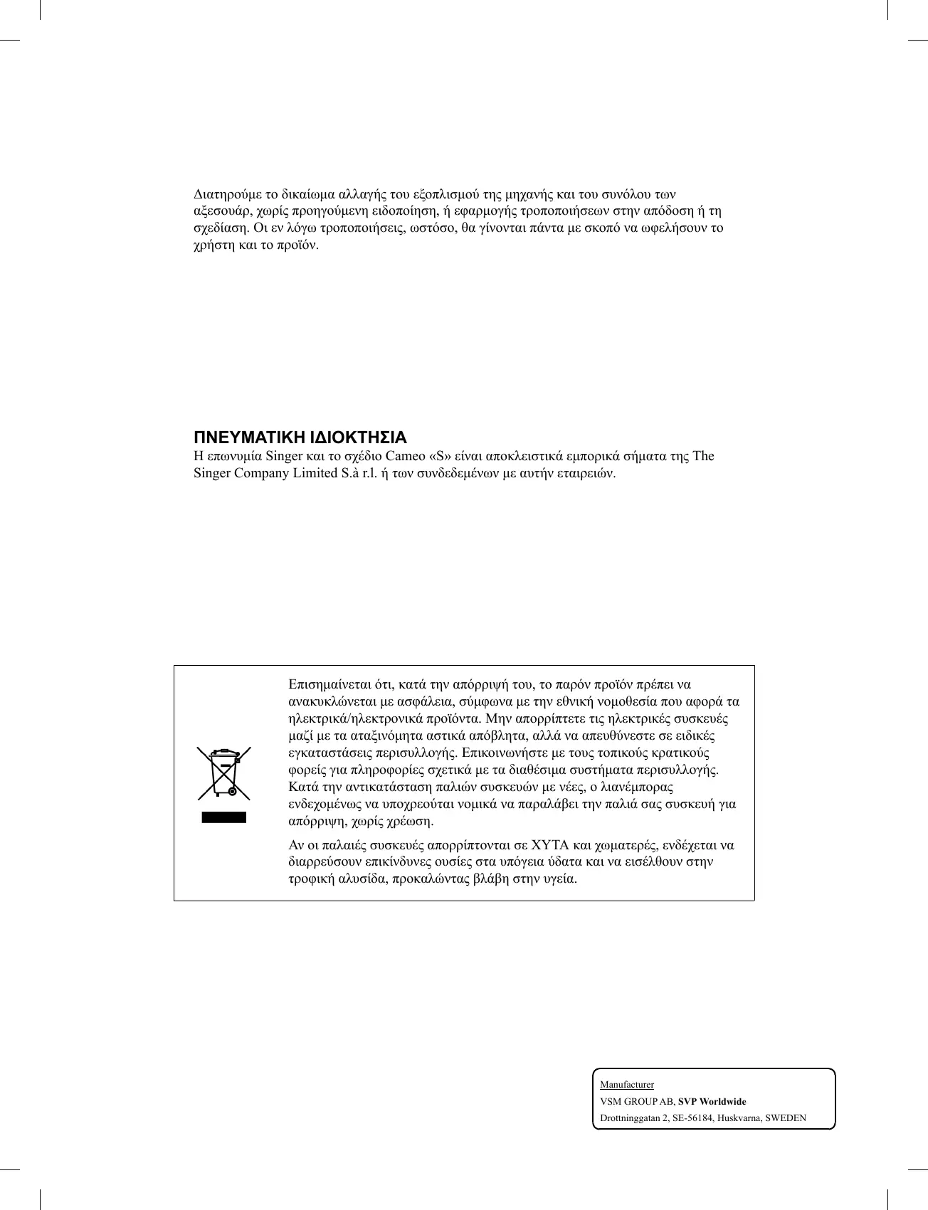 Η επωνυμία Singer και το σχέδιο Cameo «S» είναι αποκλειστικά εμπορικά σήματα της The