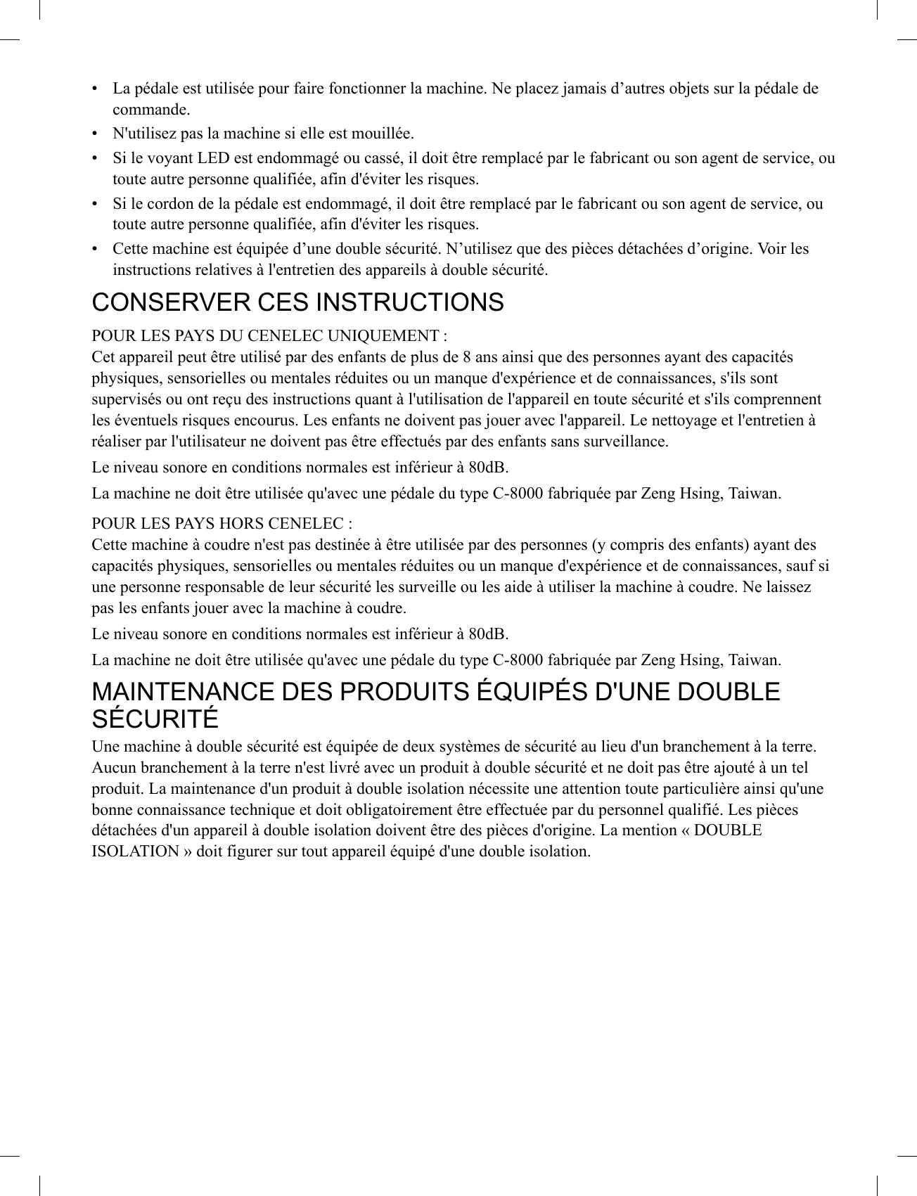 La machine ne doit être utilisée qu'avec une pédale du type C-8000 fabriquée par Zeng Hsing, Taiwan.