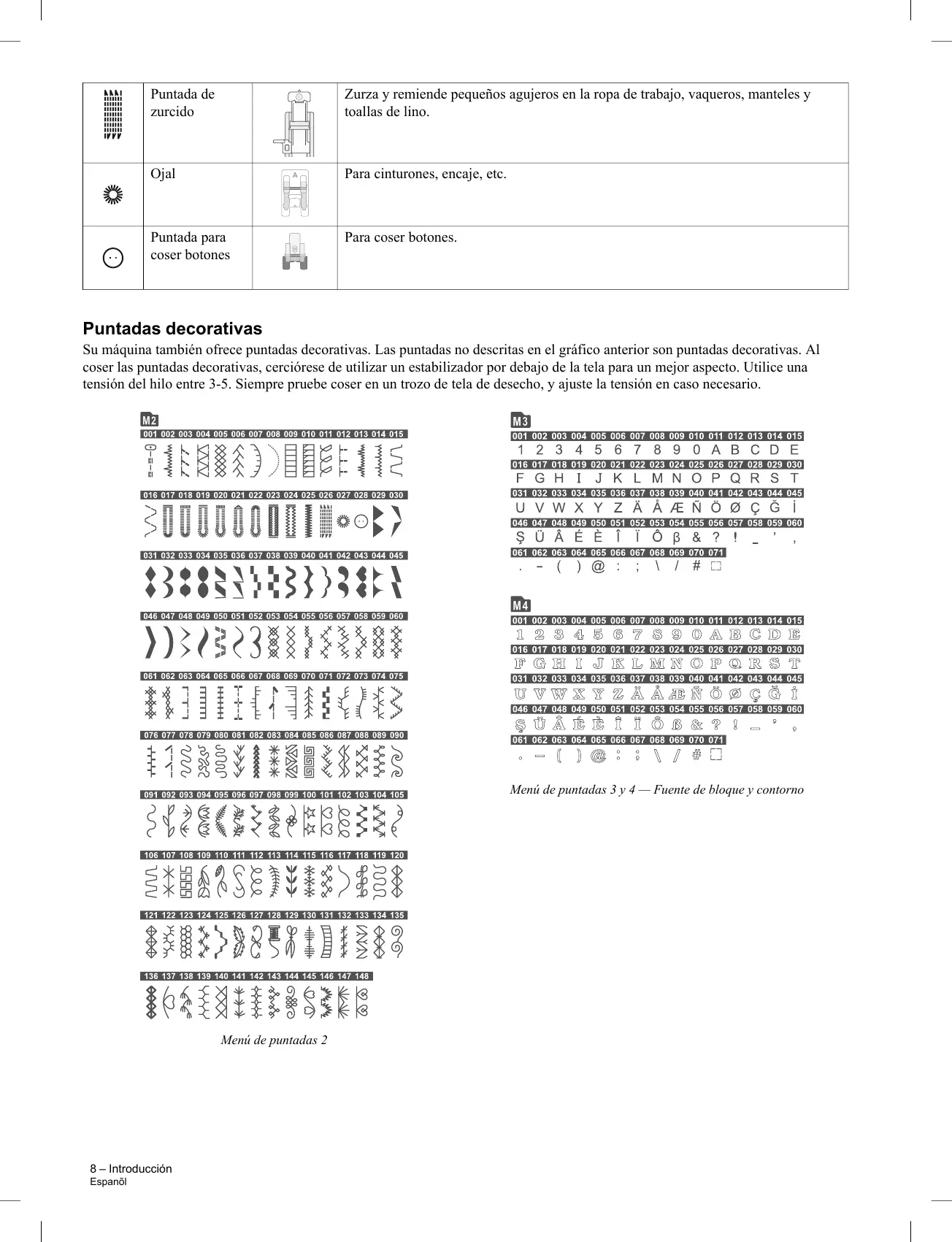 Menú de puntadas 3 y 4 — Fuente de bloque y contorno