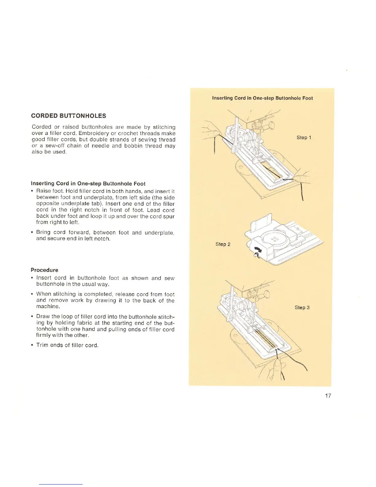 Singer TOUCH-TRONIC 2000 - Corded Buttonholes; Inserting Cord in One-step Buttonhole Foot