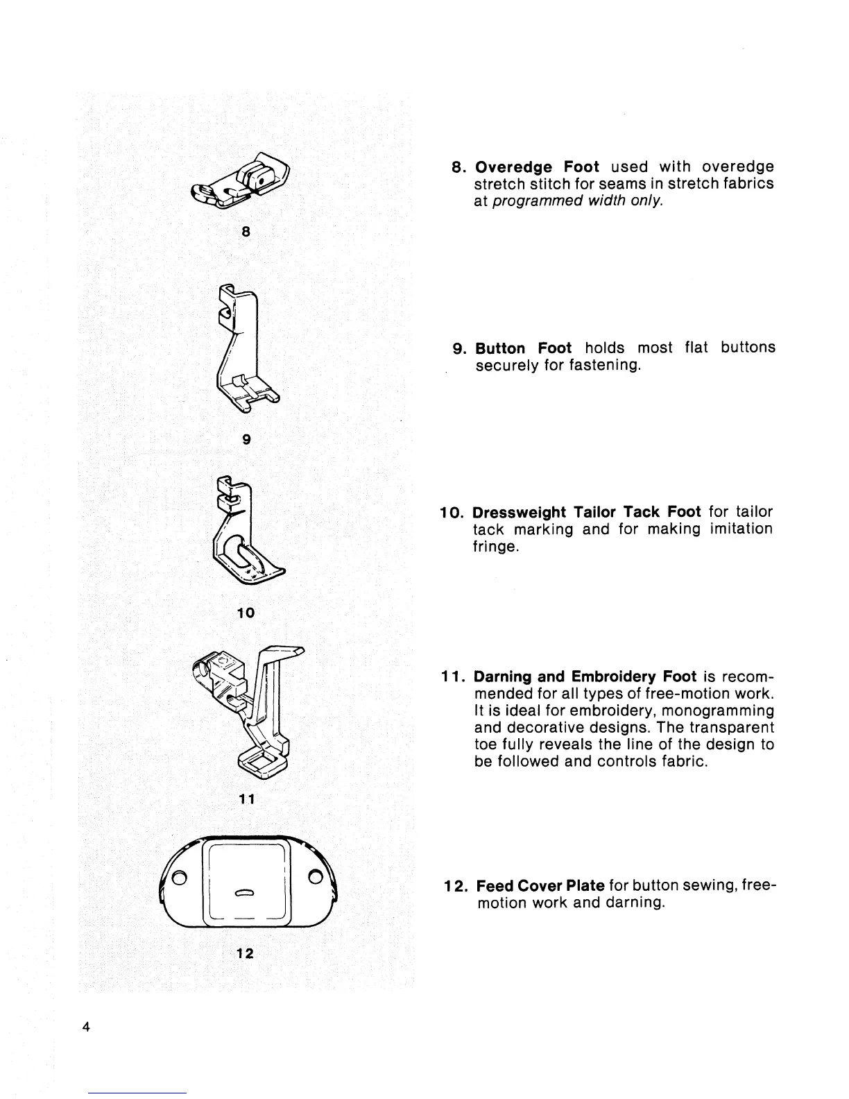 Singer Touch-Tronic 2001 - Overedge;Button Foot; Dressweight Tailor Tack Foot; Darning and Embroidery Foot; Feed Cover Plate
