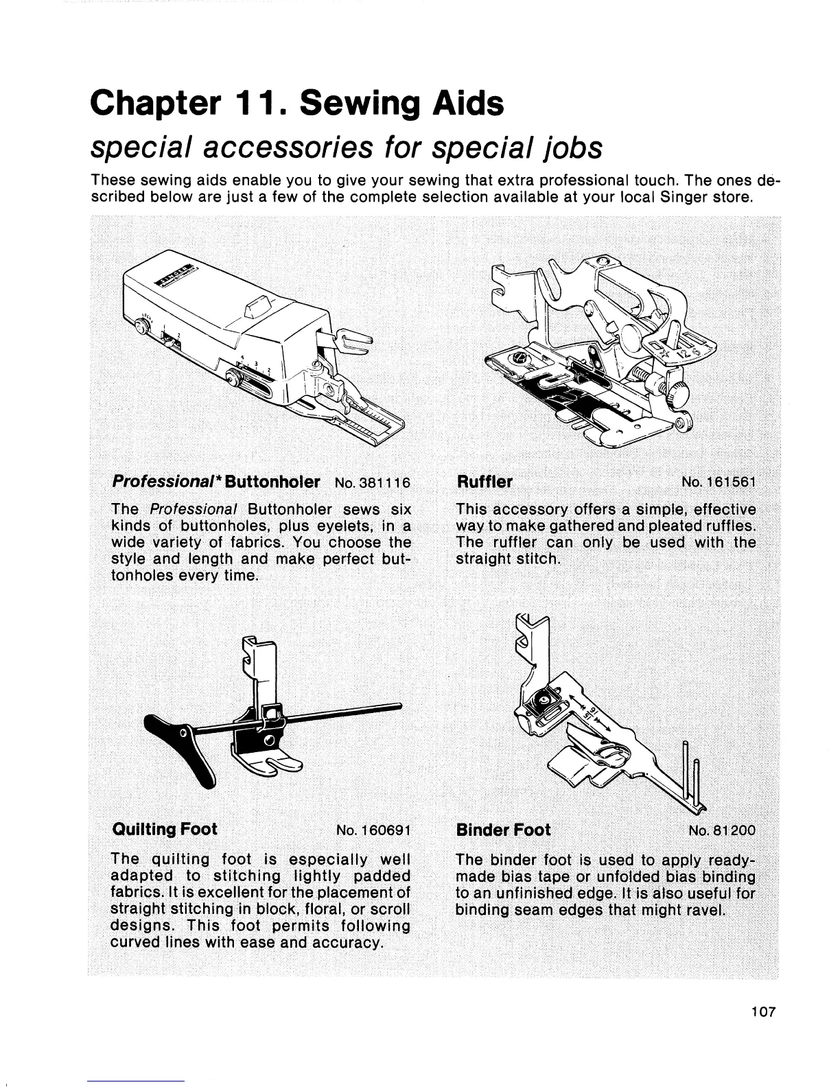 Singer Touch-Tronic 2001 - Special Accessories for Special Jobs; Professional Buttonholer; Ruffler; Quilting;Binder Foot