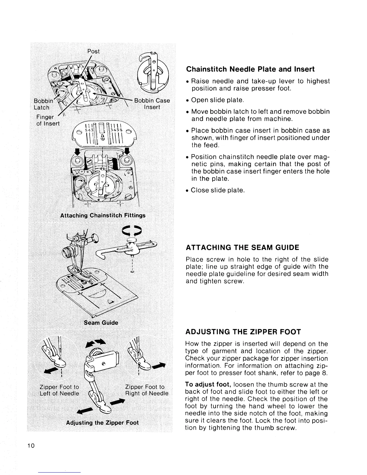 Singer Touch-Tronic 2001 - Attaching the Seam Guide; Adjusting the Zipper Foot; Chainstitch Needle Plate and Insert