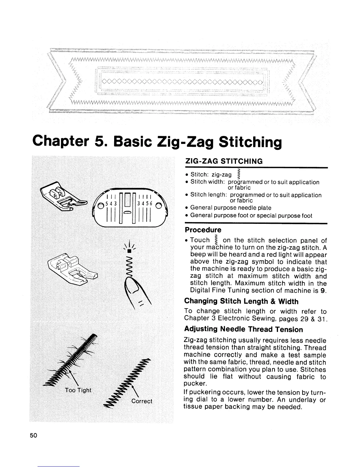 Singer Touch-Tronic 2001 - Zig-Zag Stitching; Changing Stitch Length and Width; Adjusting Needle Thread Tension