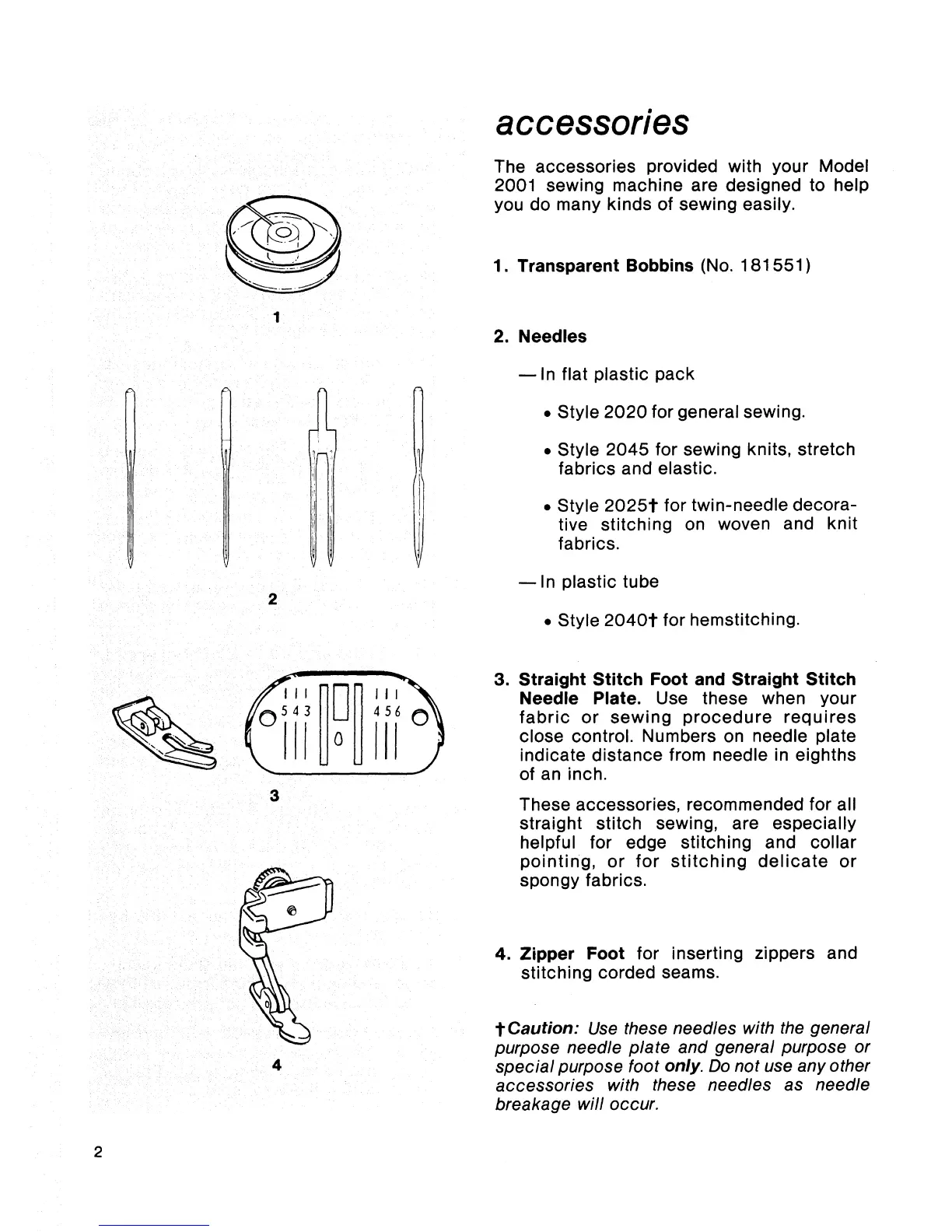 Singer Touch-Tronic 2001 - Transparent Bobbins; Needles; Straight Stitch Foot and Straight Stitch Needle Plate; Zipper Foot