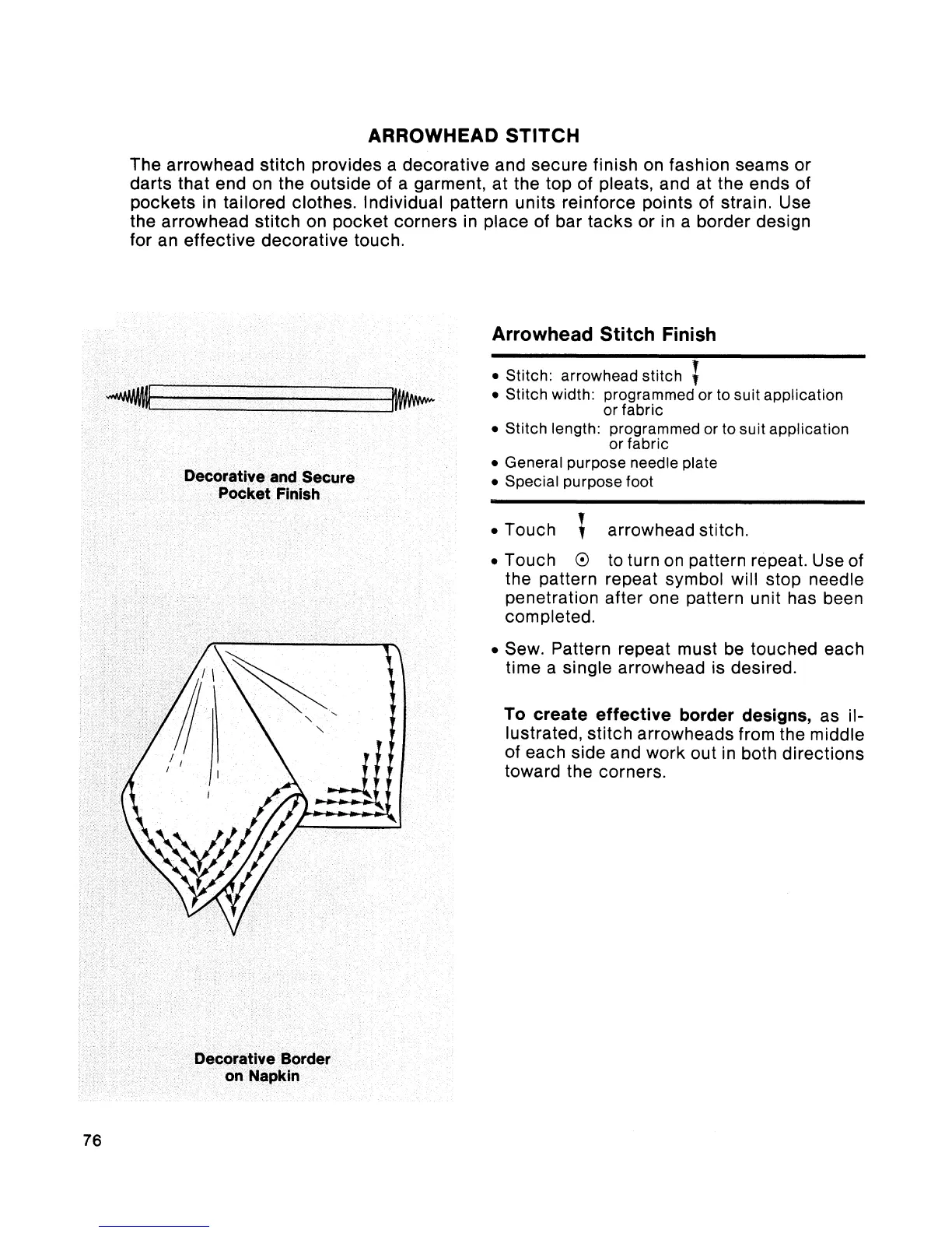 Singer Touch-Tronic 2001 - Arrowhead Stitch Finish; Decorative and Secure Pocket Finish; Decorative Border on Napkin