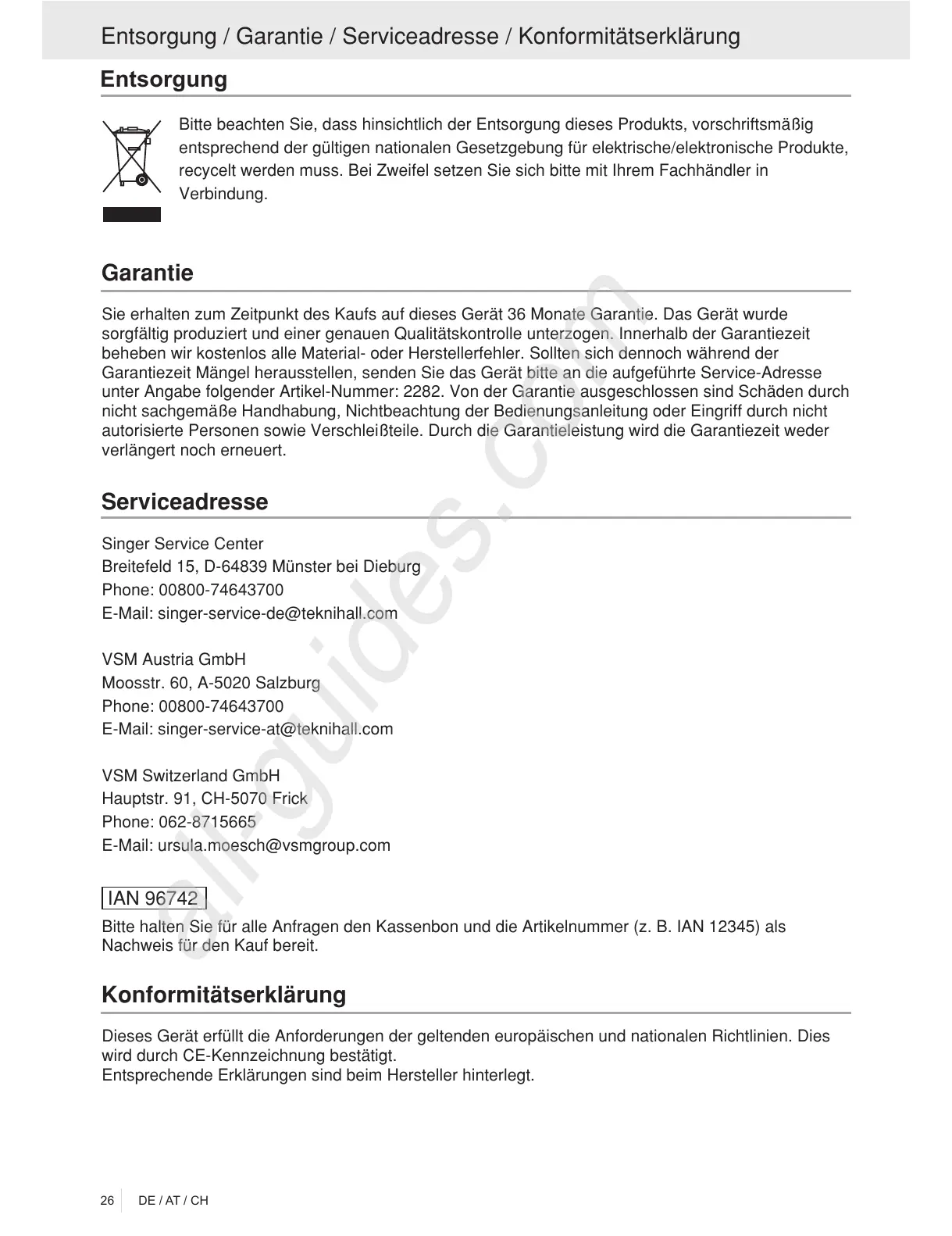 Entsorgung / Garantie / Serviceadresse / Konformitätserklärung