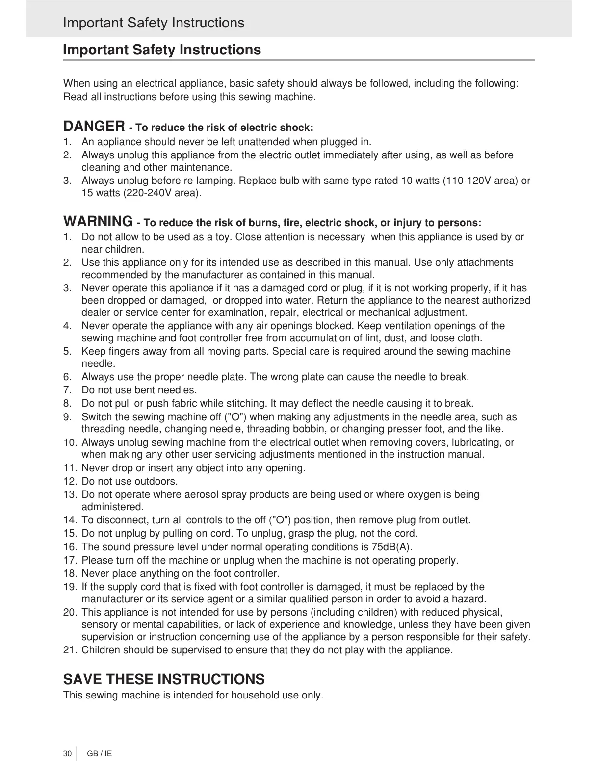 10. Always unplug sewing machine from the electrical outlet when removing covers, lubricating, or