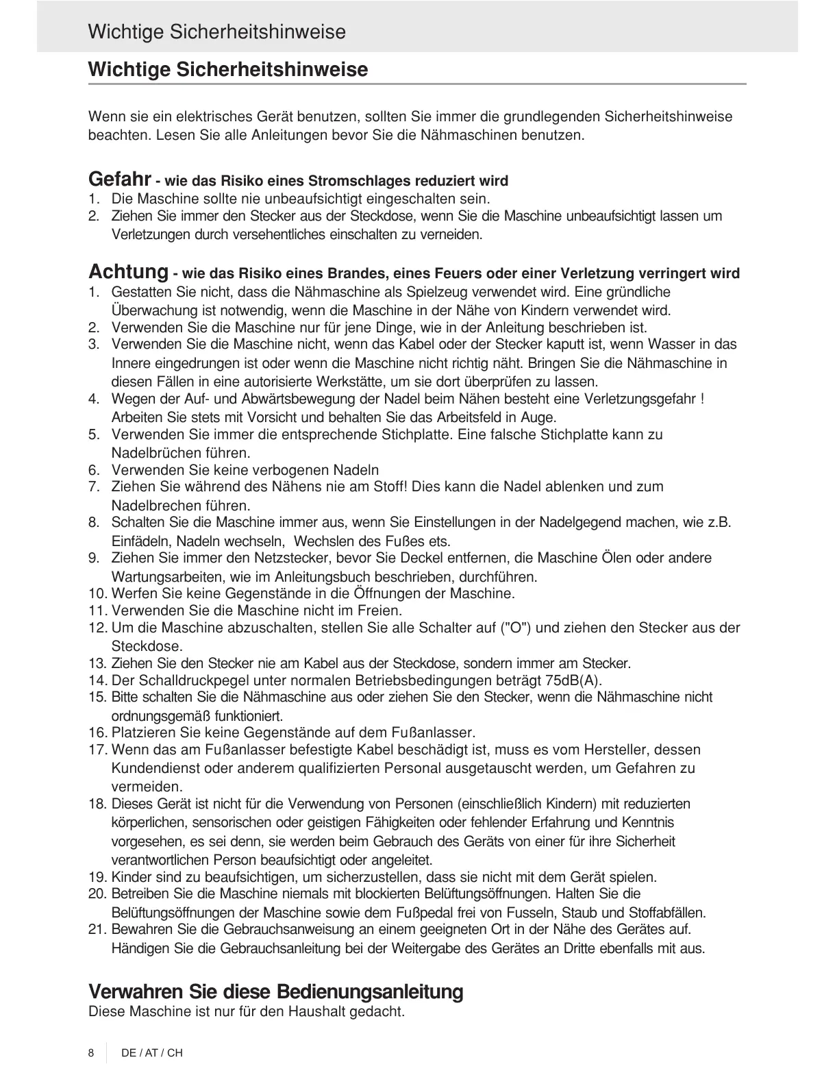 beachten. Lesen Sie alle Anleitungen bevor Sie die Nähmaschinen benutzen.