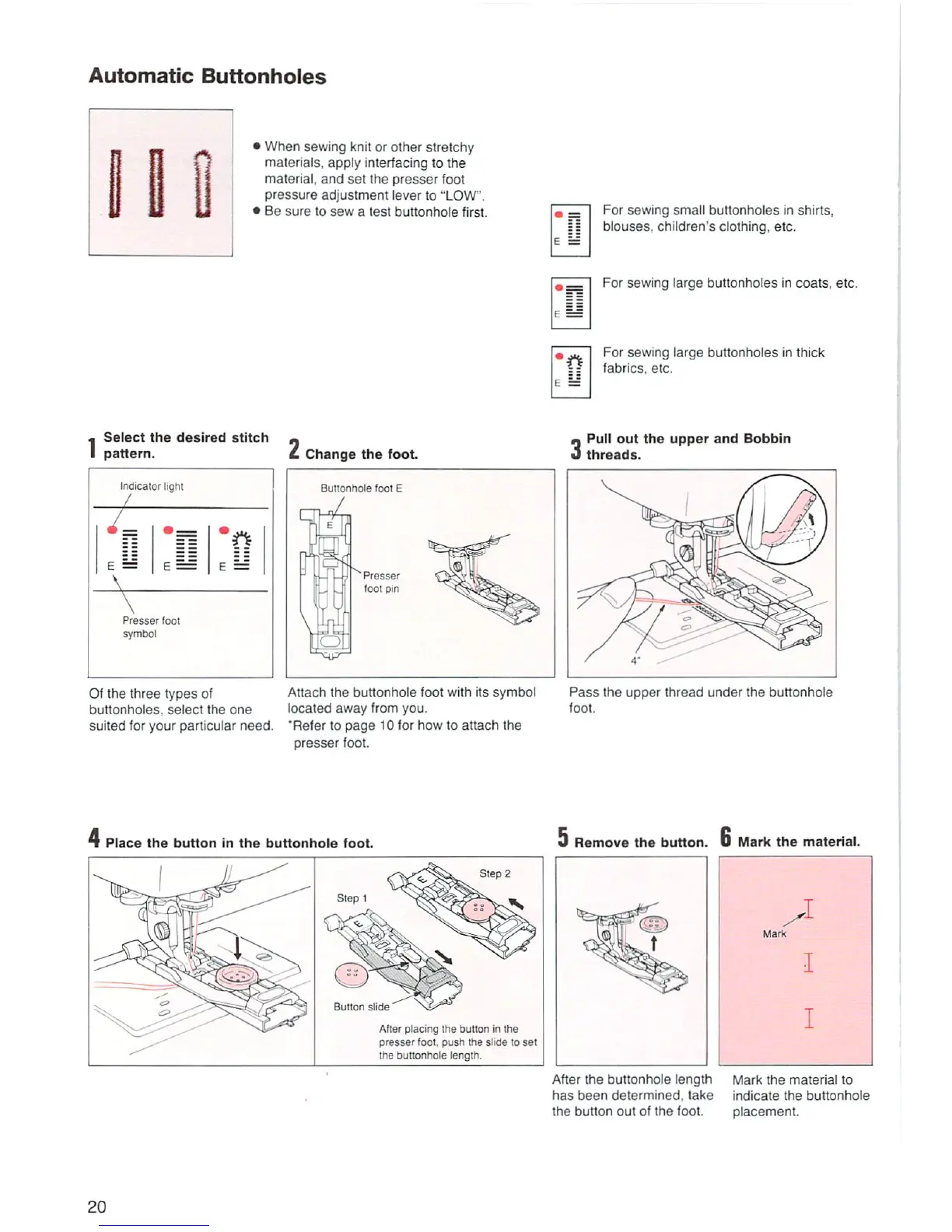 Singer XL-1 - Automatic Buttonhole Sewing; Buttonhole Types; Buttonhole Sewing Steps