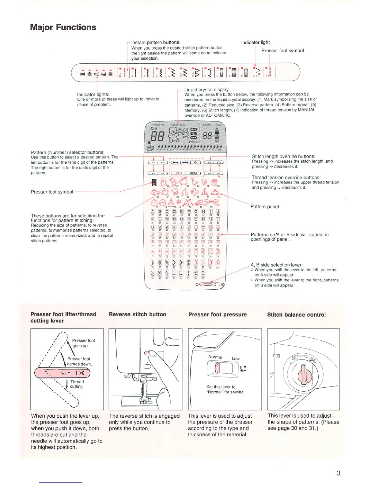 Singer XL-1 - Major Functions; Instant Pattern Buttons; Liquid Crystal Display; Pattern Selector Buttons
