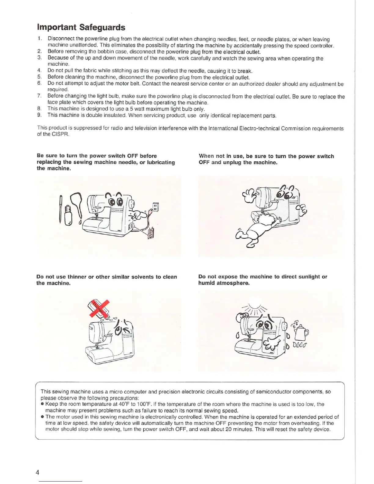 Singer XL-1 - Important Safeguards; General Safety Guidelines; Operational and Environmental Warnings