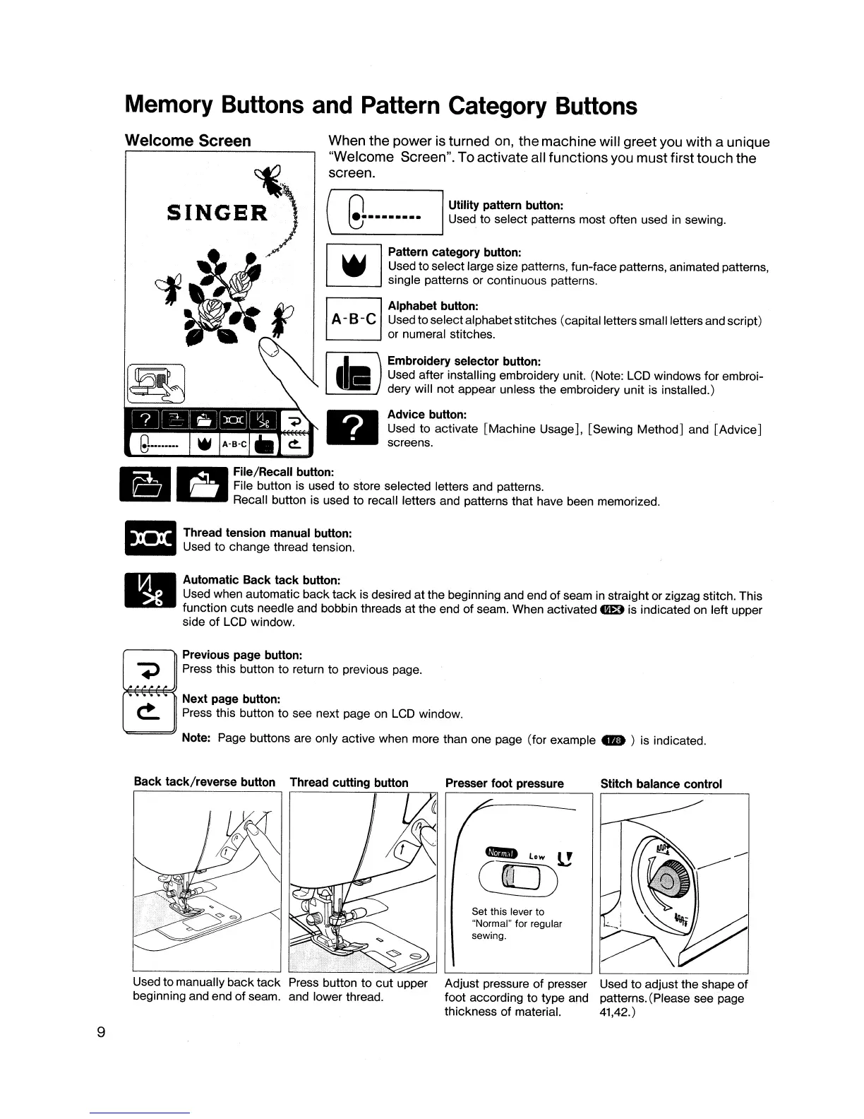 Singer XL-1000 - Memory Buttons and Pattern Category Buttons; Welcome Screen
